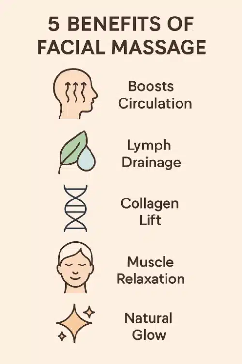 Facial massage improves circulation, encourages lymphatic drainage, and supports collagen production for healthier skin.